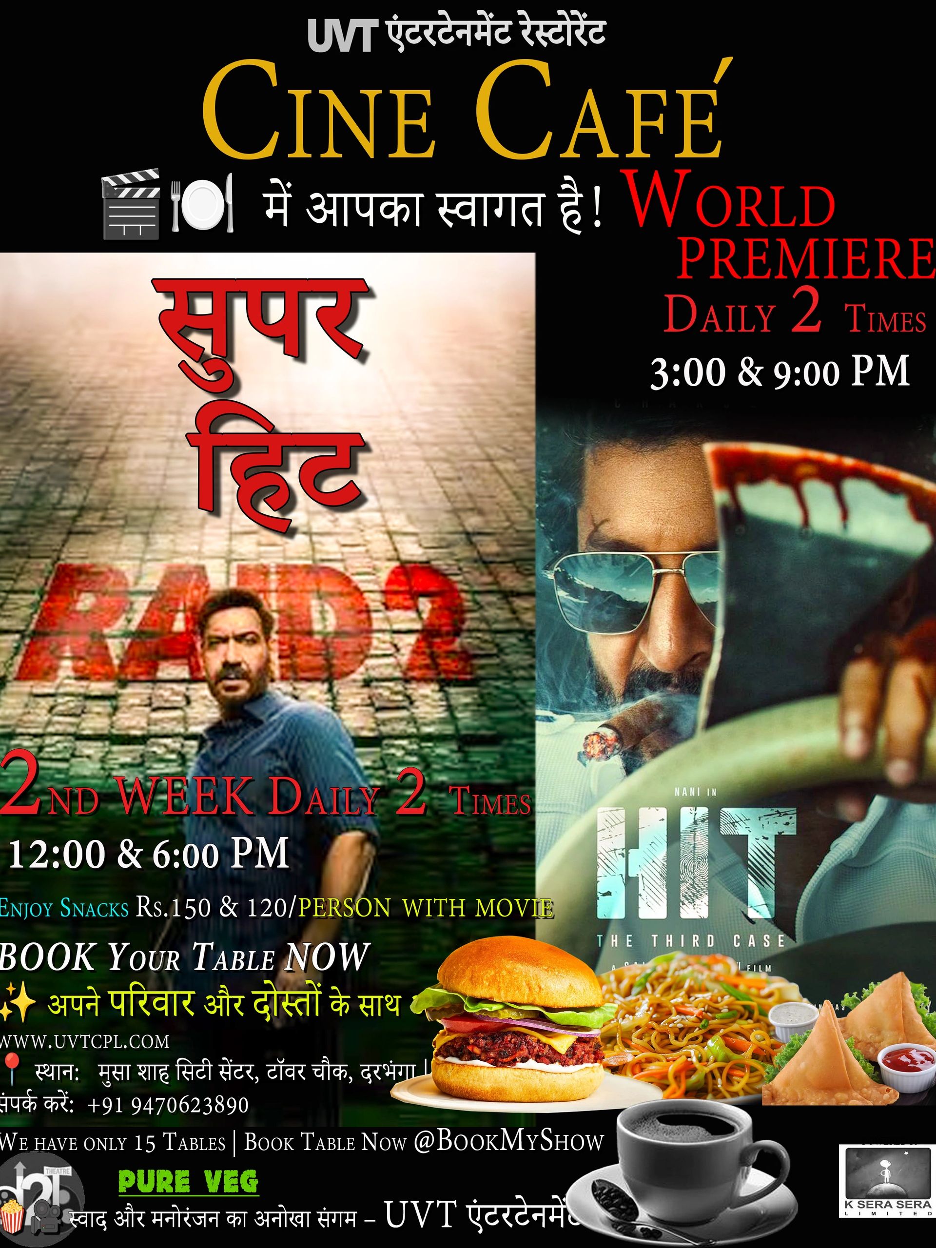 UVT Entertainment Restaurant has brought to you, India’s 1st Cine Café in Darbhanga at Musa Shah City Centre, Tower. 1st time UVT got license from the filmmakers to screen their new movies simultaneously with the world premiere in a restaurant. We are taking out films from the traditional cinema halls to the restaurants. In UVT Entertainment Restaurant gives freedom of movement and the a table in front of you with delicious food 🍛 . We are serving beverage + Veg Snacks @200 with a BlockBuster